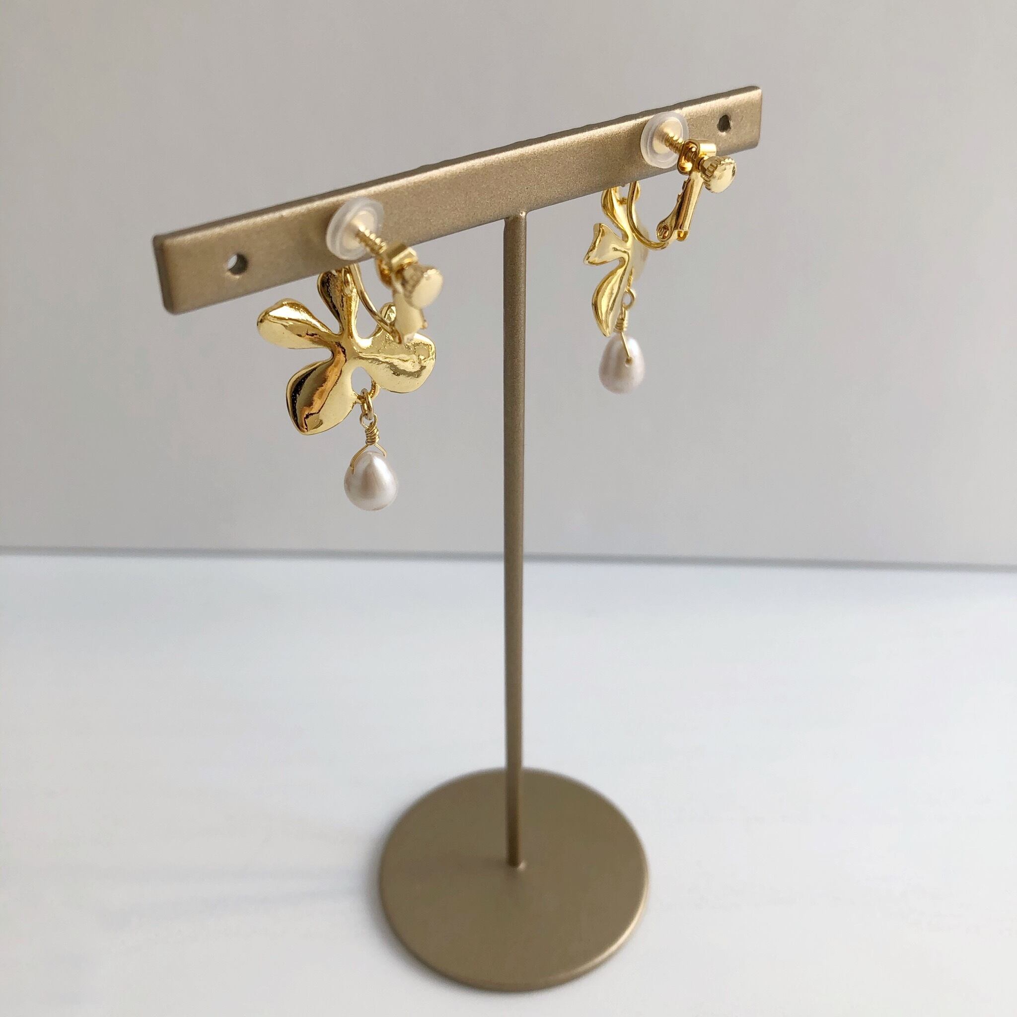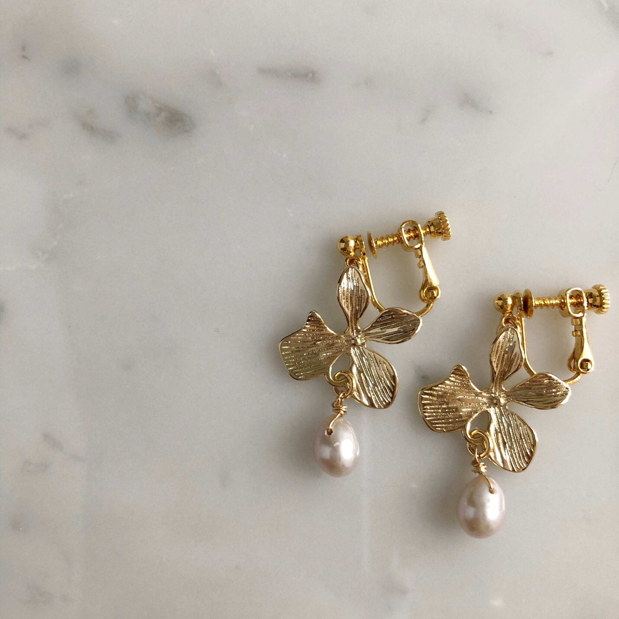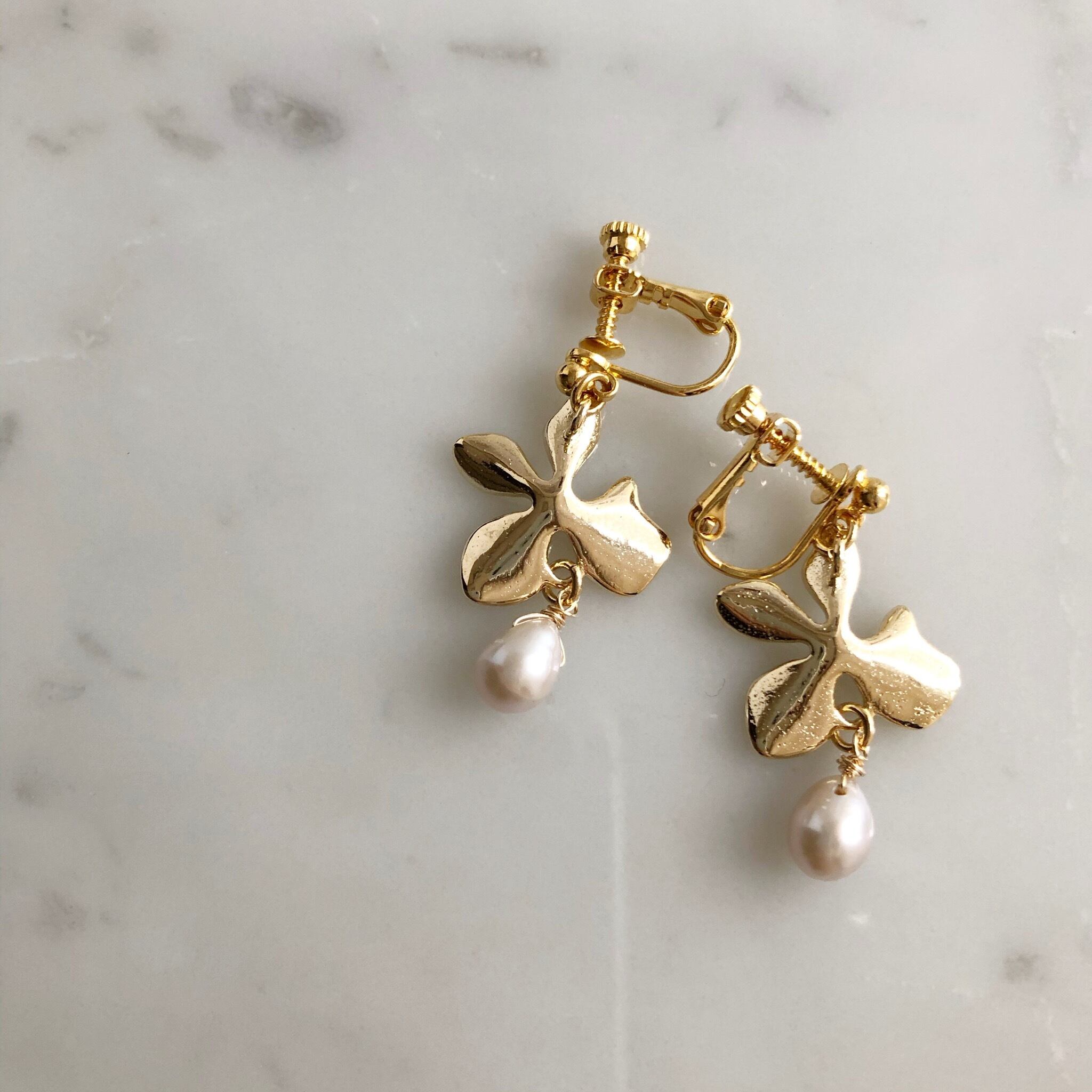 グレーパールは完売しました。【leaf】花びらと朝露のイヤリング 痛くないイヤリング
