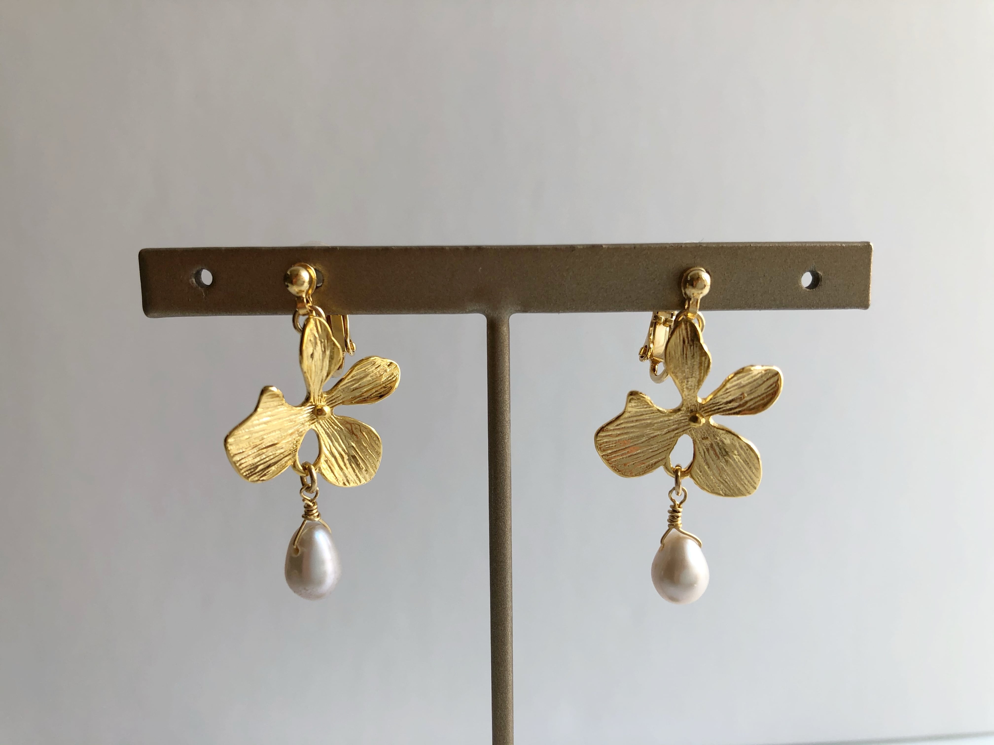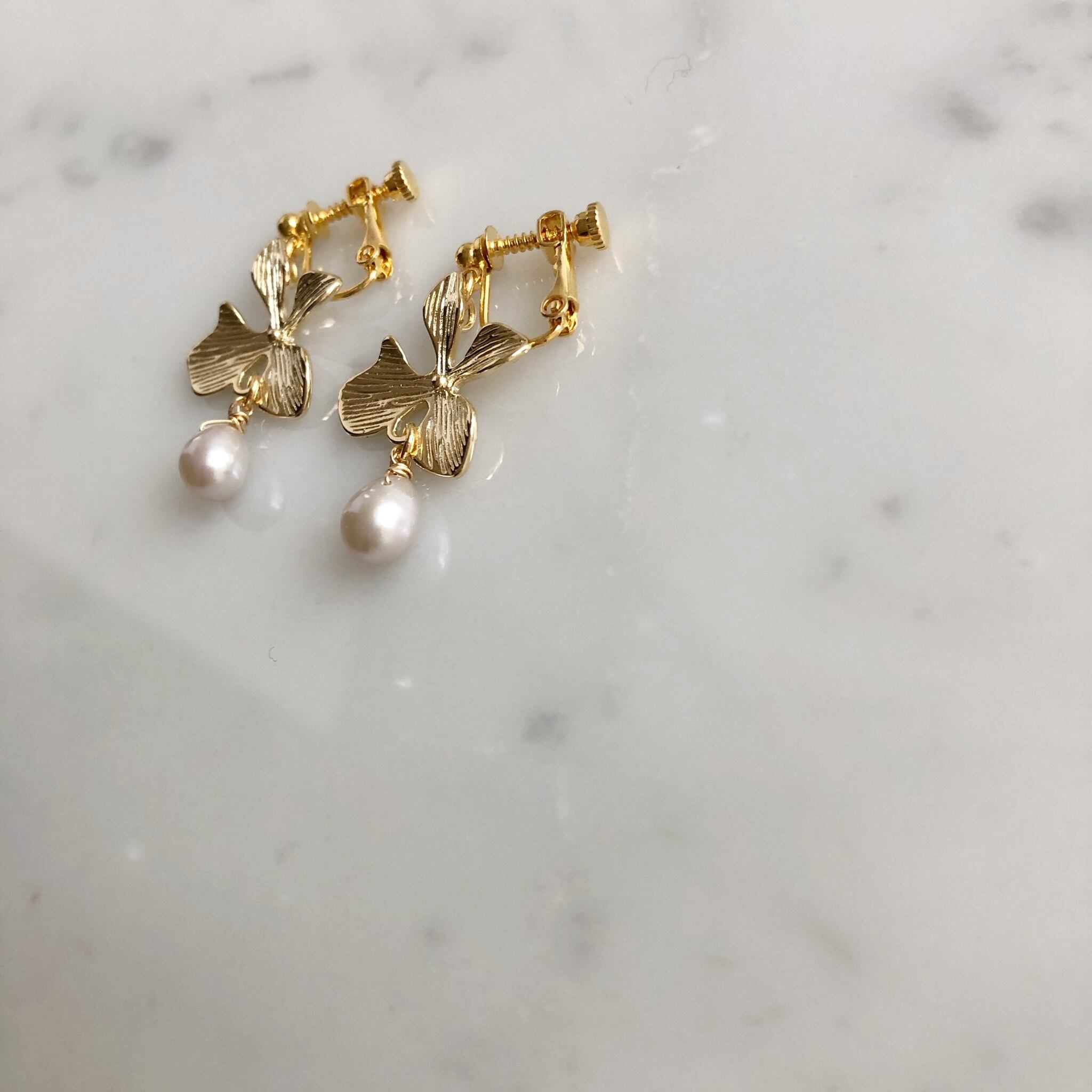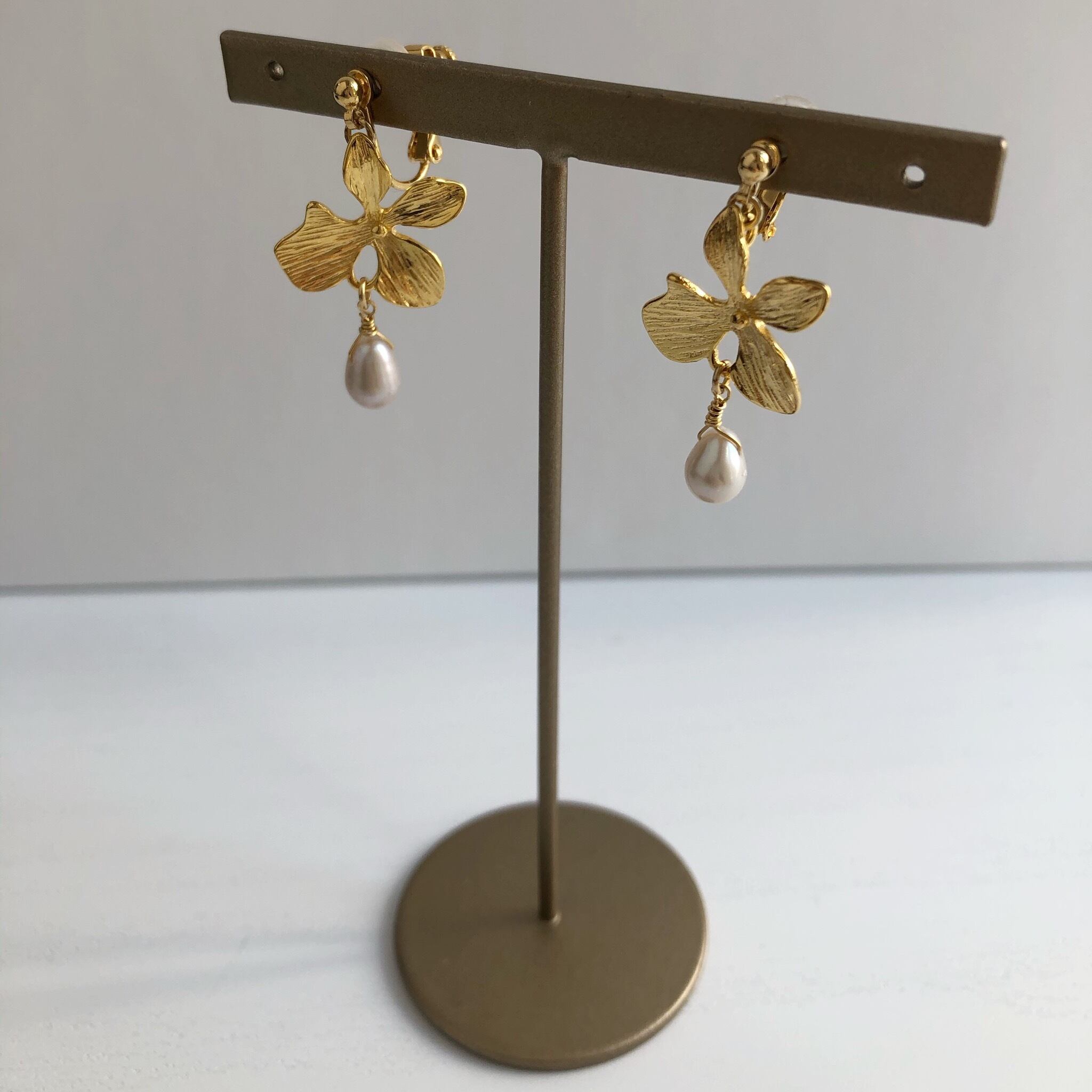 グレーパールは完売しました。【leaf】花びらと朝露のイヤリング 痛くないイヤリング
