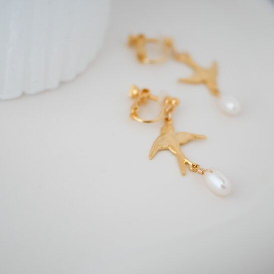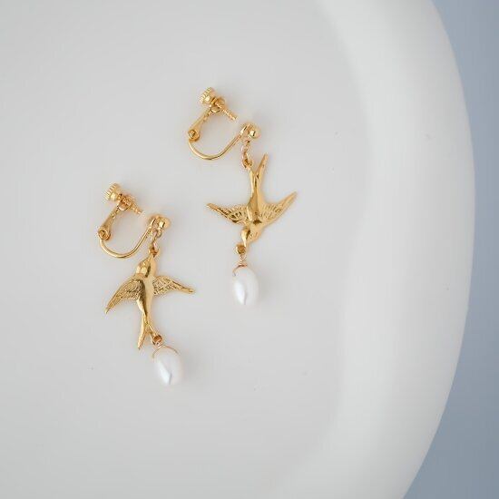 幸せを運んでくれると言われているつばめのモチーフと上品な淡水パールを組み合わせたイヤリング。